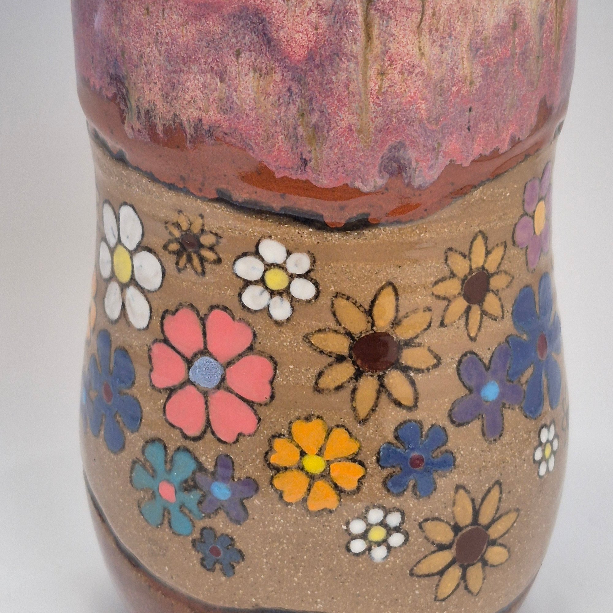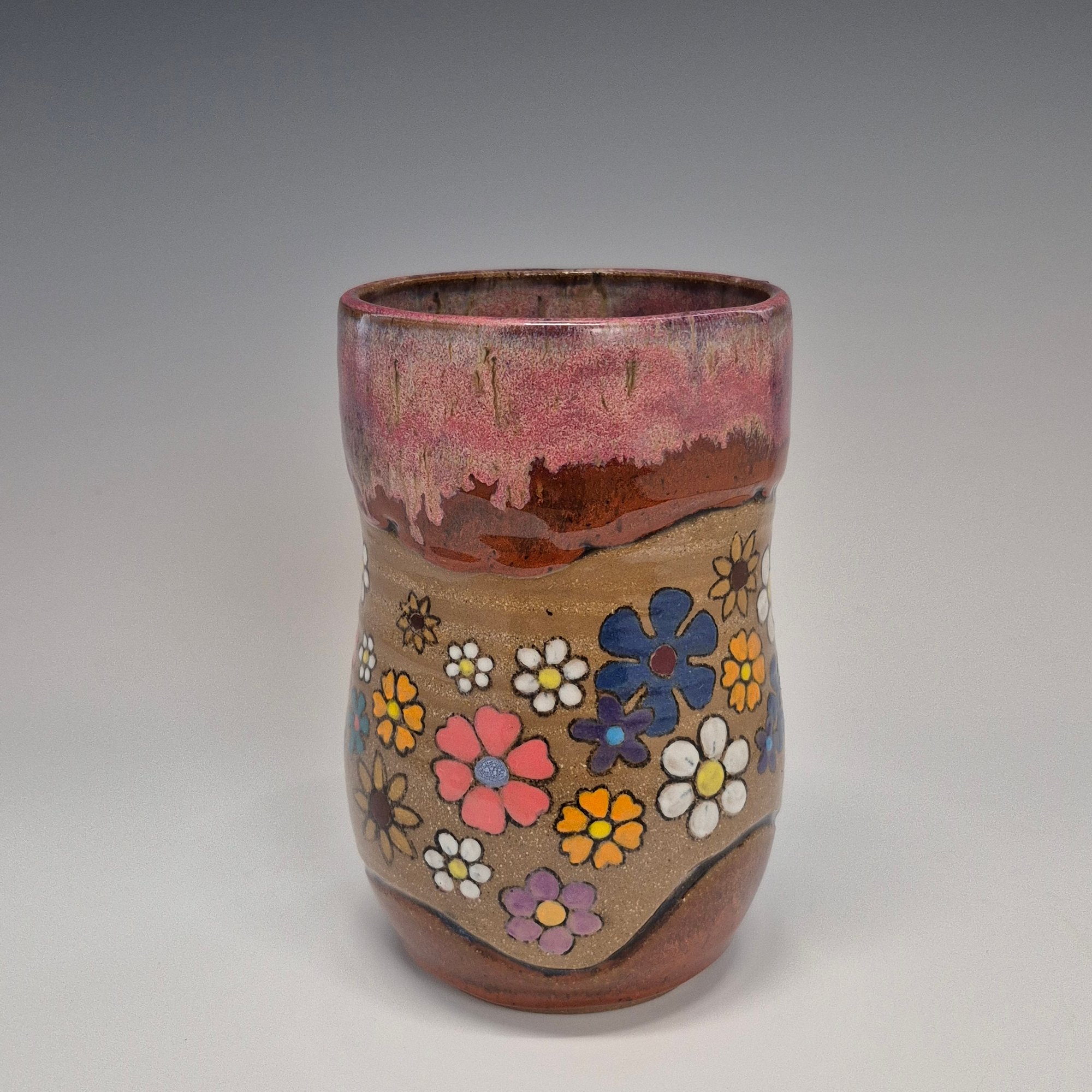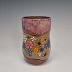 Discounted: Please see first photo. This tumbler has a tiny, stone that presented itself during the glaze firing on the rim. The tumbler is completely functional. The stone may be felt, depending on if you decide to drink from the tumbler without a straw. The tiny stone is directly above the pink flower at the very top of the rim. The price is set with consideration of this surface anomaly.
